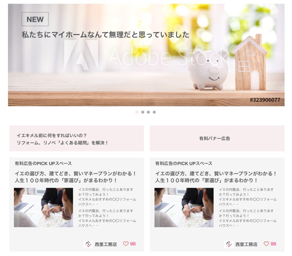 企業情報や施⼯事例(物件)の記事だけではなく、不動産を購⼊(リフォーム)する前に不動産を“楽しみながら知る“ための情報コンテンツを充実。