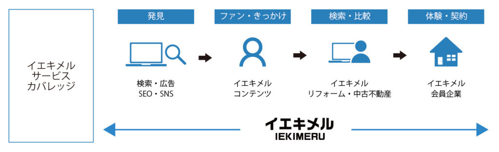 イエキメルでは定額低価格から御社の面倒なPR業務をおまかせできます。またリフォームと中古不動産に特化し、独自のWEBマーケティングにより確度が高い集客および新世代のファン(見込み顧客)の獲得ができます。