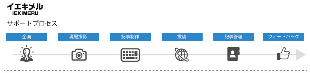 また、「イエキメル」なら広告PR材料に必要な現場撮影や広告⽂⾯作成、掲載打込み作業も代⾏いたしますので、専属従業員の配置や業務時間を奪われません。