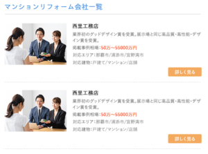 職種はリフォーム関連業者様や設計事務所様、また中古不動産取扱いの管理業者や仲介業者様がいらっしゃいます。